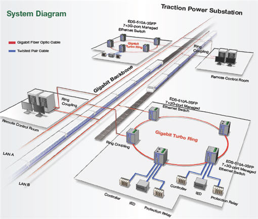在牽引變電所之間,100臺EDS-510A-3SFP以太網(wǎng)交換機構(gòu)成了數(shù)目龐大的冗余通信環(huán)路。根據(jù)地鐵車站的分布位置,還為每一個冗余通信環(huán)路分配了不同的虛擬局域網(wǎng),從而可實現(xiàn)對每個車站段的單獨管理。為了將子系統(tǒng)集成到主系統(tǒng)中,每個冗余環(huán)配置了兩臺EDS-510A以太網(wǎng)交換機,并通過環(huán)耦合技術(shù)連接千兆骨干網(wǎng)上的不同局域網(wǎng)段。EDS-510A系列交換機都支自愈技術(shù),恢復時間少于20ms,從而為電力監(jiān)控系統(tǒng)提供了隨時可用的網(wǎng)絡(luò)連接,該功能也大大增強了鐵路網(wǎng)絡(luò)電力系統(tǒng)的可靠性。