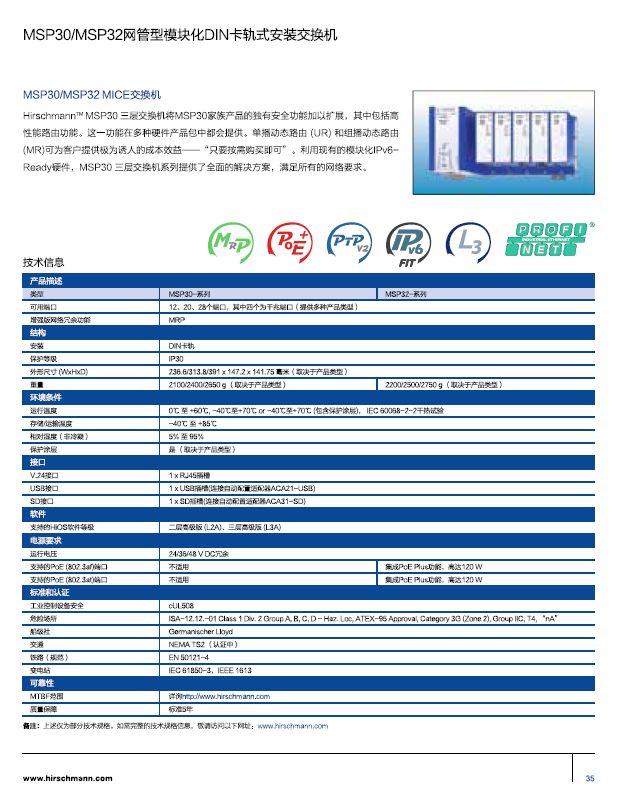 MSP30-X交換機的部分重要功能特點包括:用于實時數(shù)據(jù)的“精密時間協(xié)議2”(Precision Time Protocol version 2),用于網(wǎng)絡(luò)擴展的L3路由功能,-40?C至+70?C的工作溫度范圍,高達100%的工作相對濕度,以及能夠?qū)⒕W(wǎng)絡(luò)可用性最大化的眾多安全功能。此外,它還配備了額外的支架,可將模塊安裝在設(shè)備主機上;并提供了以太網(wǎng)線,這些以太網(wǎng)線可通過M12連接器緊固在模塊上。