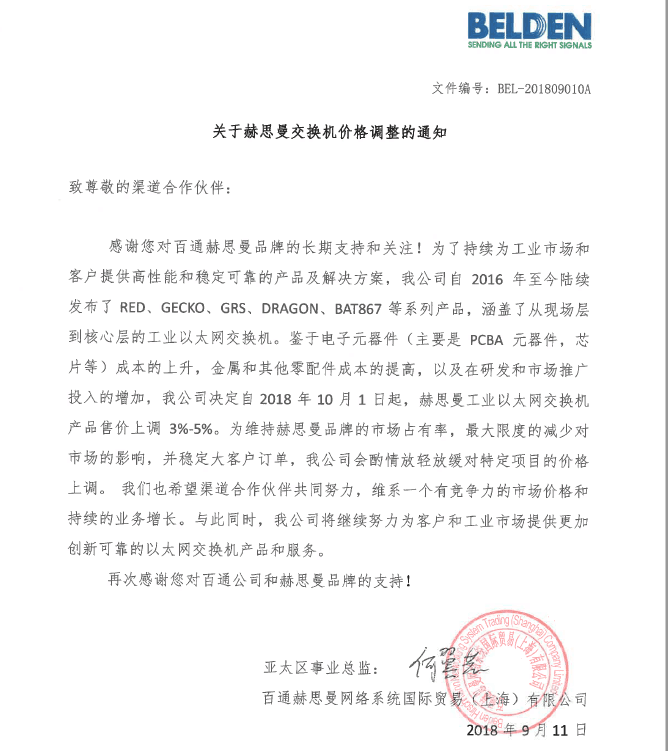 2018年關(guān)于赫思曼工業(yè)交換機(jī)價(jià)格調(diào)整通知