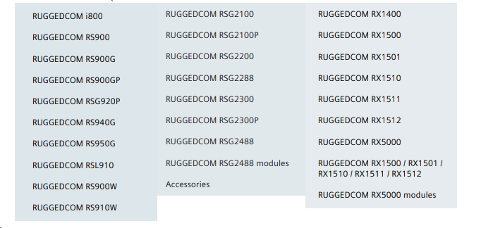 型號(hào):RUGGEDCOM RX1400、RUGGEDCOM RX1500、RUGGEDCOM RX1511、RUGGEDCOM RM1224、RUGGEDCOM RST2228、RUGGEDCOM RSG2488、RUGGEDCOM M969