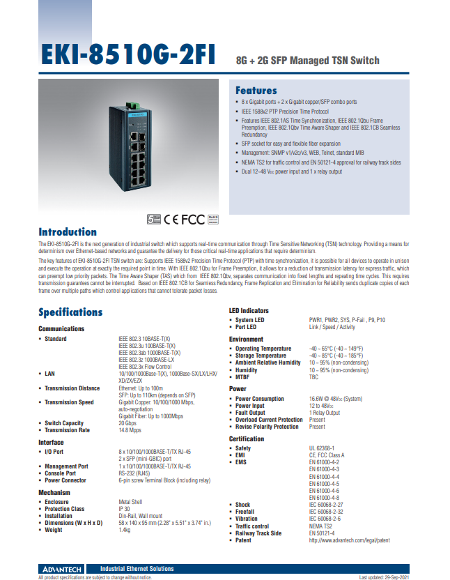 • The EKI-8510G-2FI is the next generation of industrial switch which supports real-time communication through Time Sensitive Networking (TSN) technology. Providing a means for determinism over Ethernet-based networks and guarantee the delivery for those critical real-time applications.