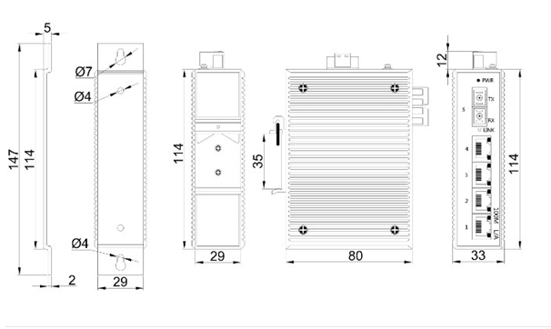 標準3.5寸導(dǎo)軌安裝,114mm×80mm×33mm