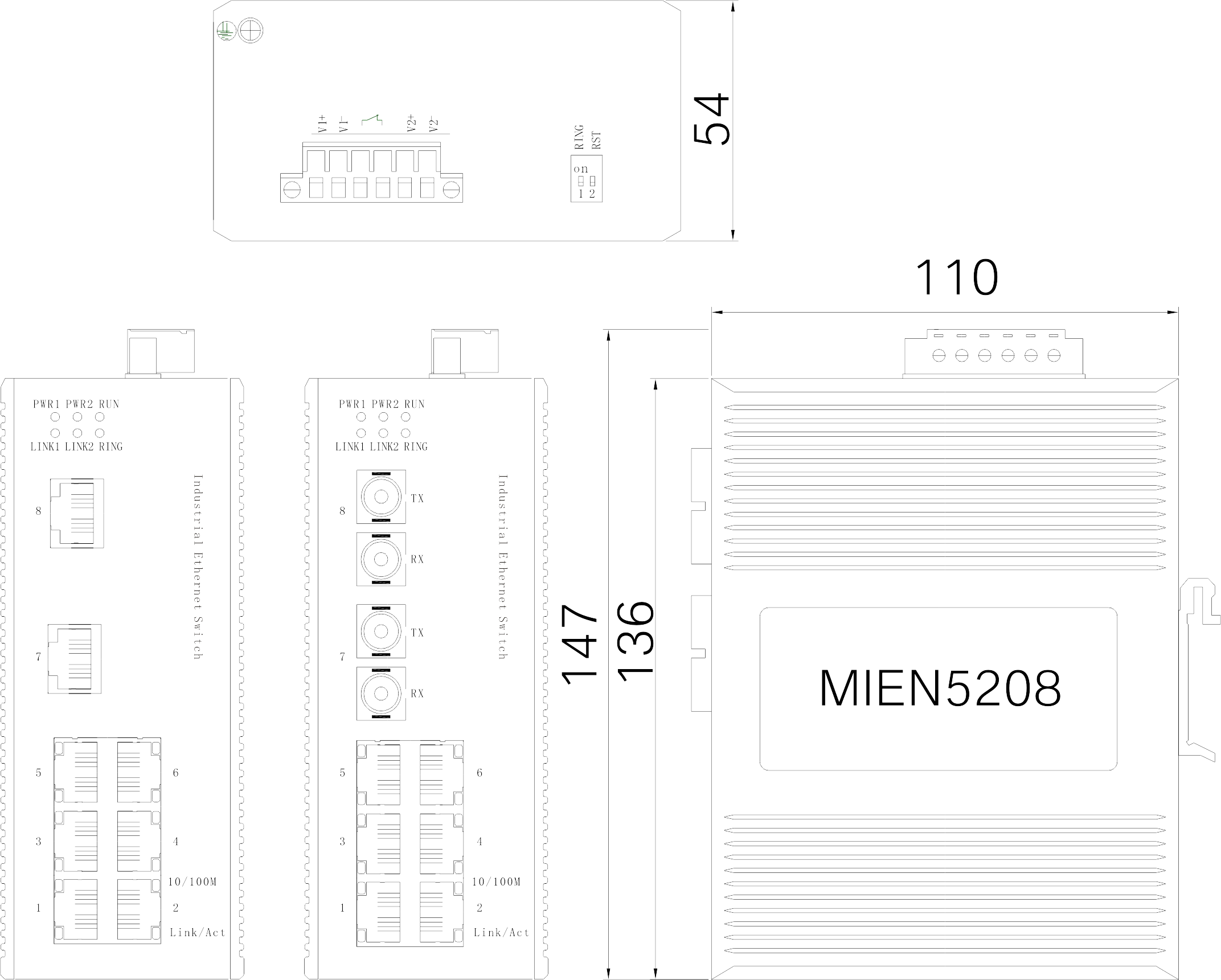 | 例如:MIEN5208-2S-SC20:2個(gè)百兆單模SC光口,傳輸距離20km,6個(gè)百兆電口,標(biāo)配直流雙輸入電源DC12~48V |