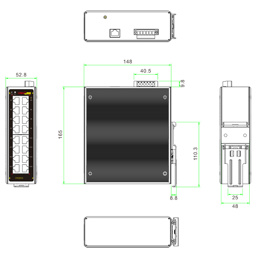 16個(gè)10/100/1000M RJ45端口, 2組V+,V- 冗余DC電源接口(鳳凰端子); 端口防雷:6KV 8/20us;防護(hù)等級(jí):IP40 ,待機(jī)功耗:<10W;滿載功耗:<20W