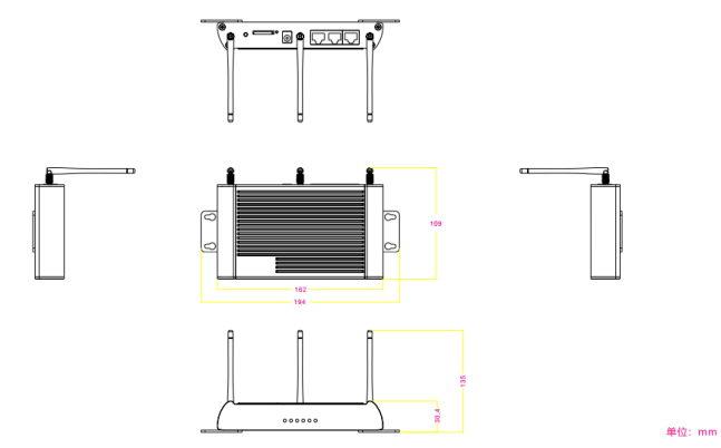 ■ 創(chuàng)新設(shè)計,功能強大 ◇ 支持DC9-24V寬電壓輸入,能更好的兼容工業(yè)接入,免去現(xiàn)場施工煩惱。 ◇ 配備3根高增益外置全向天線,WIFI下行峰值速率可達(dá)300Mbps , 讓您信號更強,上網(wǎng)更快。 ◇ 設(shè)備采用硬件看門狗以及軟件多級鏈路檢測機制雙重設(shè)計,具備故障自動檢測,自動恢復(fù)能力,保證設(shè)備穩(wěn)定可靠 運行。 ◇ 獨創(chuàng)網(wǎng)絡(luò)鏈路檢測, 4G 網(wǎng)絡(luò)不穩(wěn)定可進(jìn)行快速的 4G 斷線自動重拔。自適應(yīng)4G/3G/2G 網(wǎng)絡(luò)智能切換,保證可靠傳輸不掉線。 產(chǎn)品尺寸規(guī)格